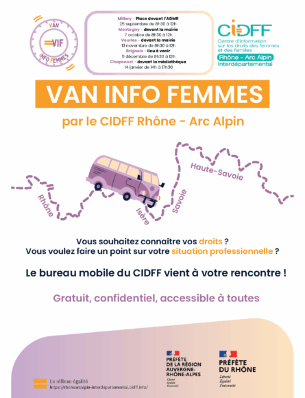 Le Van Info Femmes est un nouveau dispositif mis en place par le Centre d’Information sur les Droits des Femmes et des Familles (CIDFF) Rhône – Arc Alpin pour venir à la rencontre des femmes afin de les informer et les orienter en matière d’emploi et de droits. Ce service, gratuit, confidentiel, accessible à toutes, s’adresse à celles qui souhaitent faire le point sur leur situation professionnelle, connaître leurs droits, être accompagnées dans leurs démarches administratives, se remobiliser vers l’emploi.