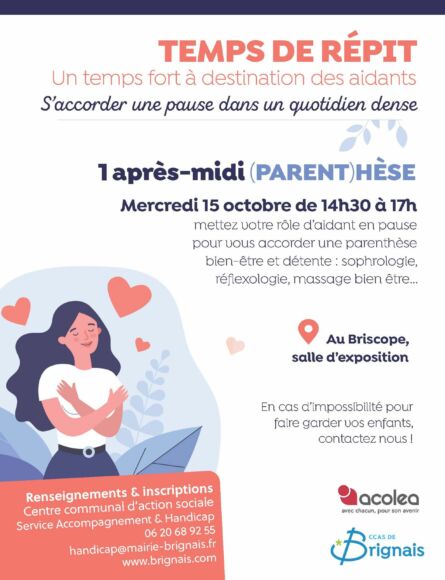 Un après-midi, mettez votre rôle d’aidant en pause pour vous accorder une parenthèse bien-être et détente : sophrologie, réflexologie, massage bien être… Inscription obligatoire auprès du service Accompagnement & Handicap.